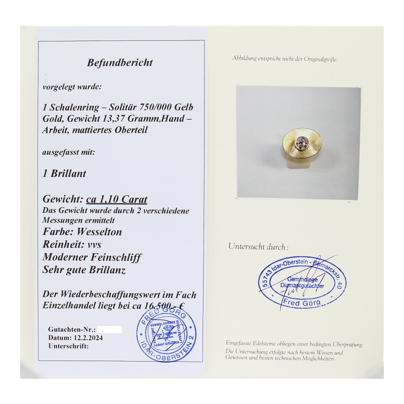 | Diamantinfos: | 1 Brillant ca. 1,10 ct. (H) Weiß (vvs) Sehr, sehr kleine Einschlüsse |